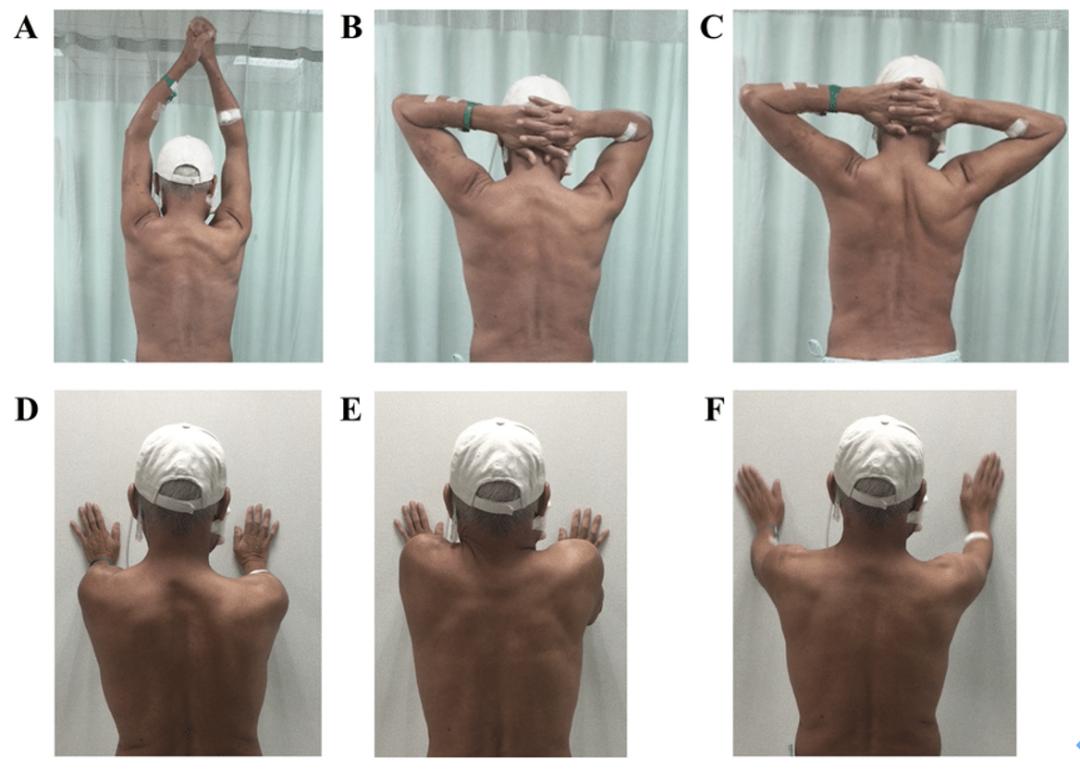 (A-C):握住双手高举过顶、落下置于脑后,再夹紧双侧肩胛骨;(D)推墙练习;(E)推墙同时上提肩胛骨;(F)推墙同时手臂做旋转