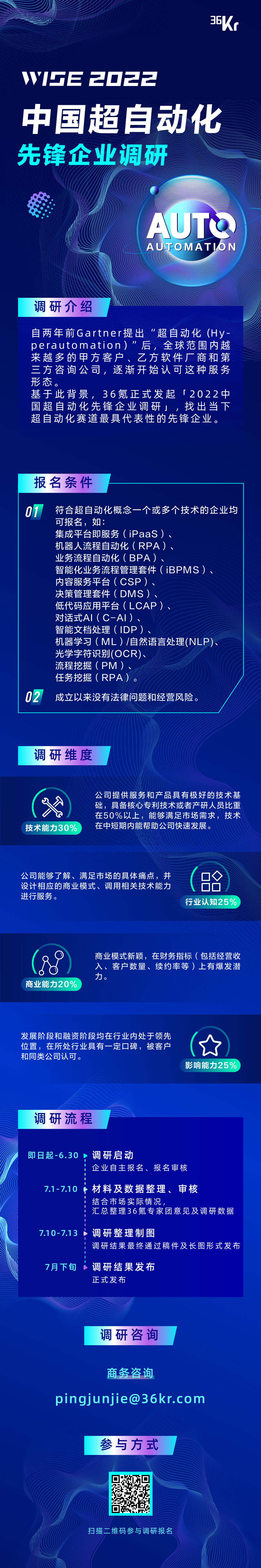 自即日起,「2022中国超自动化先锋企业调研」接受企业报名,报名将于6月30日截止。36氪研究院及行业分析师等专家团将综合调研数据,于7月下旬正式对外公布最终调研结果。