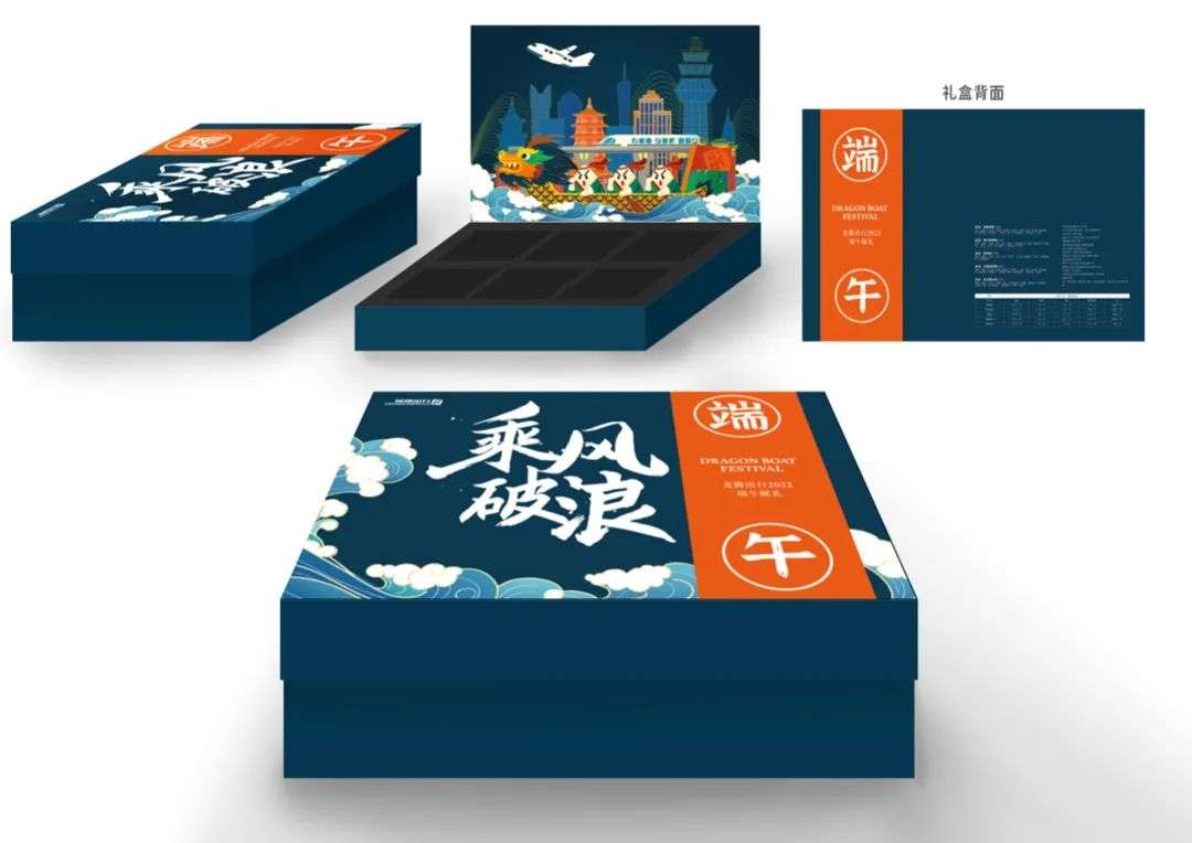 龙腾出行依托端午节水上赛龙舟的视觉主题,提取出海底蓝和龙舟橙作为礼盒的主色调。海底蓝象征着困境与挑战,而龙舟橙则暗示着团结一心、战胜当前疫情困难的决心与希望。