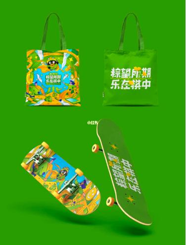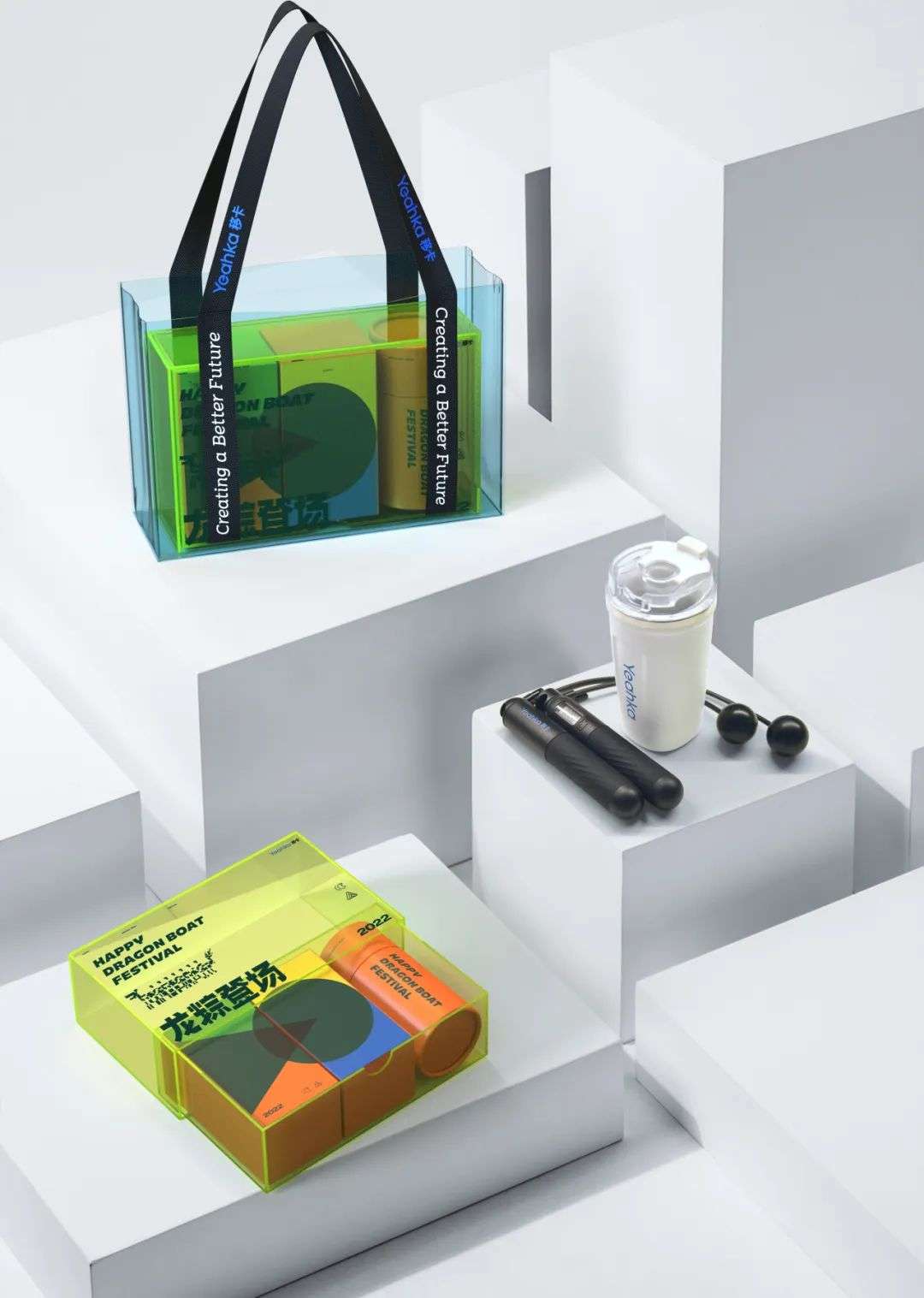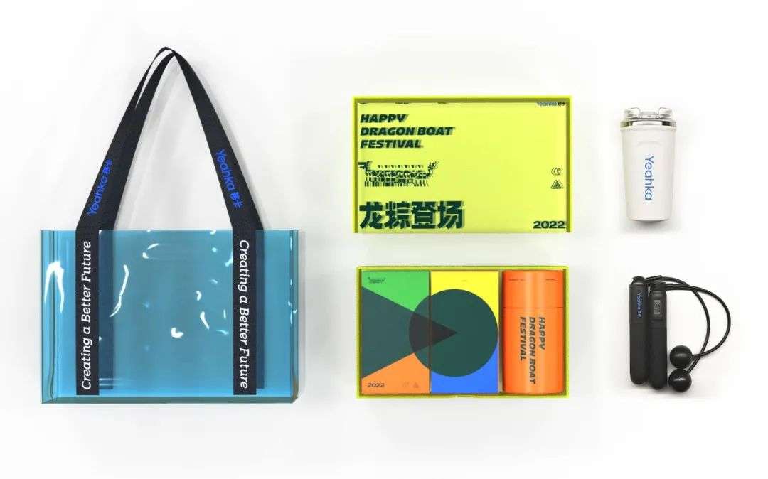 移卡今年的端午礼盒主题是「龙粽登场」,融入了运动、国潮、健康、环保等元素。从包装设计来看,礼盒的外壳和购物袋的配色都格外的大胆,充满了当前流行的运动与国潮感。除咸粽和甜粽外,随机搭配定制无绳跳绳和咖啡杯一个。