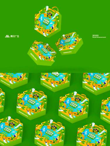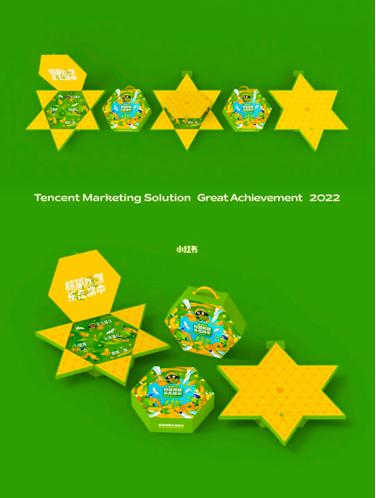 腾讯广告将礼盒包装与跳棋结合在一起,将棋盘、腾讯企鹅、粽子跳棋子、花、以及代表B端的报表、统计符号、邮件等元素汇聚在一起,完美适配六边形的包装盒。
