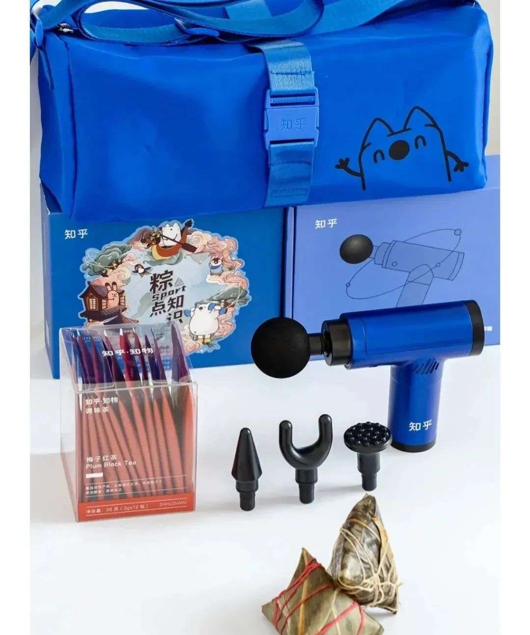 知乎的端午礼盒还是主打知识——“粽点知识”,刘看山同款蓝色健身包不错。除了粽子一盒,最大的亮点有一把:迷你筋膜枪。虽然去年很流行,但鉴于这玩意容易坏,多一把挺好。