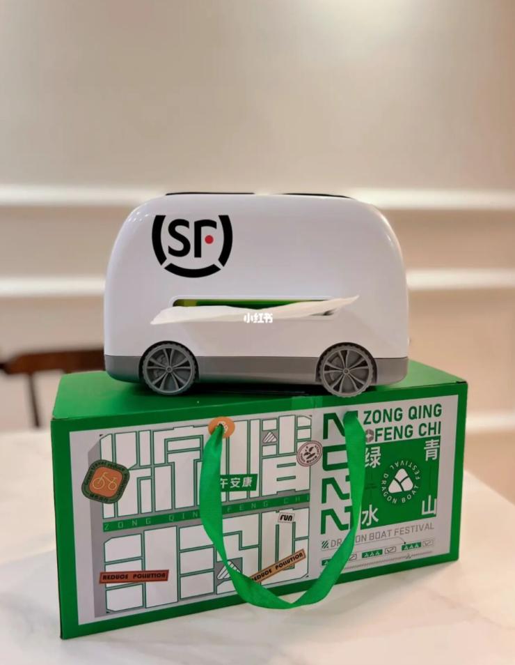 顺丰的端午礼盒叫做“粽情丰驰”,将粽子和鸭蛋放置在顺丰的大白车之中,特意宣传了自家的无人车业务。此外,这个车还可以做成抽纸盒收纳盒也挺实用。