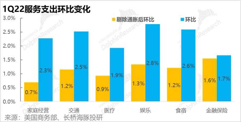 从我们对美国一季度宏观经济的分析和展望出发,我们发现虽然在高通胀&货币收水的背景下美国居民的商品消费有所疲软,但随着海外走出omicron疫情影响,防疫措施基本解除,在居民活动回归户外和线下的浪潮下,美国整体的服务支出增长则相当强劲,交通、娱乐和就餐住宿支出的增长则尤为突出。即便下半年欧美宏观经济势头继续下滑,我们认为,当地居民压抑已久的吃喝玩乐需求会报复性的释放,从而使出行文旅相关行业仍有相对坚挺的表现。
