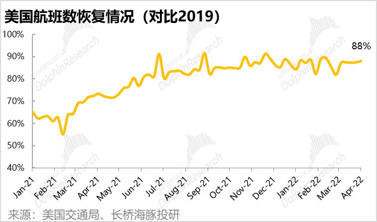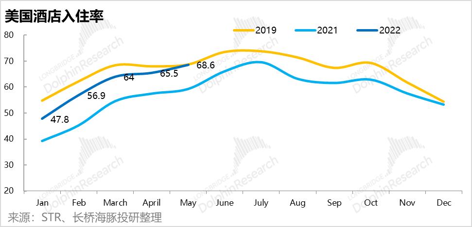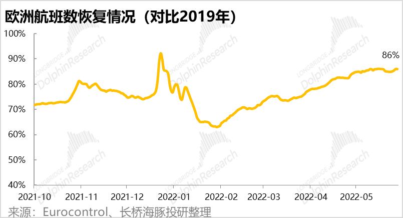 首先从欧美居民出行的角度,原先出行复苏显著落后的欧洲,在22年2月后也迎来了强劲的反弹。截至5月末,欧洲的航班量已恢复到19年同期86%的水平,与美国的复苏程度已基本相当。至此,欧美居民的出行热度已接近到疫情前的水平。