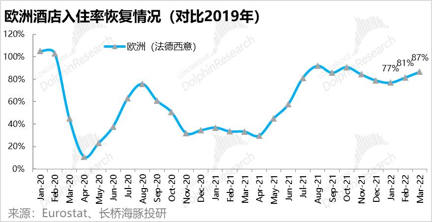 相比航班数,酒店入住的恢复情况更加乐观。到5月份美国的入住率已恢复到68.6%,自2020年疫情爆发以来,已首次追平了19年同期的入住率。而欧洲酒店入住的恢复程度虽稍有落后,但22年以来也在持续上涨,到3月底也已恢复到19年同期87%,我们相信在二季度内肯定还在进一步提升。因此,总的来说欧美的出行和住宿需求已经恢复了常态,且目前仍处于向上的趋势当中。