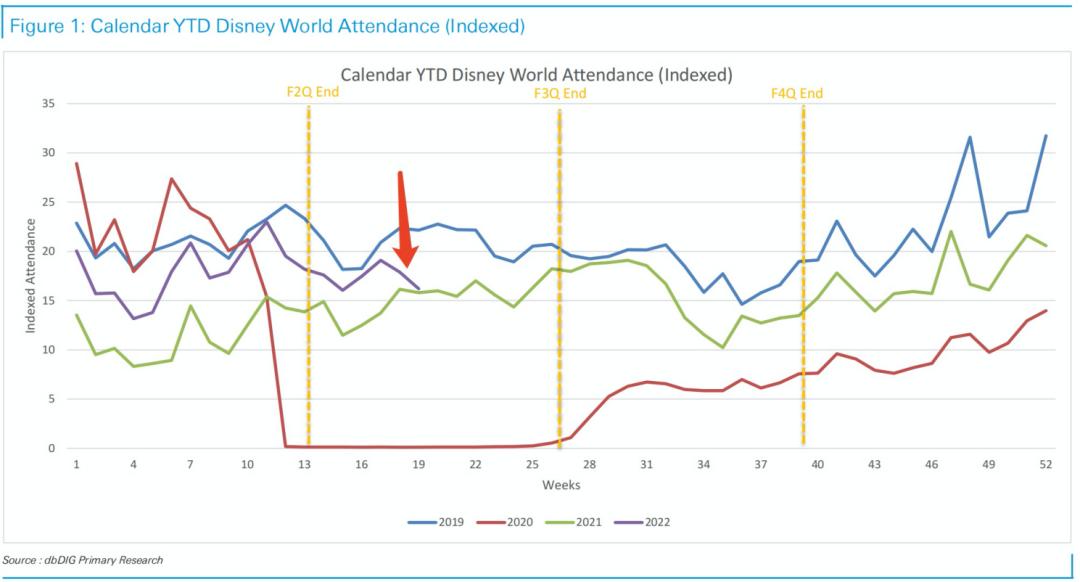 4月下旬,迪士尼完全取消了口罩的强制要求,但从美国本土的两个主题公园人流量来看,并未出现明显的抬升,与此同时,佛州迪士尼在5月中下旬也出现了较明显的降温。除了市场猜测的可能由迪士尼与佛州州政府关系恶化带来(“同性恋法案”、“芦苇溪改善区”自治权等事件),还有的可能潜在因素就是通胀的影响,不过这还需要进一步观察确认。