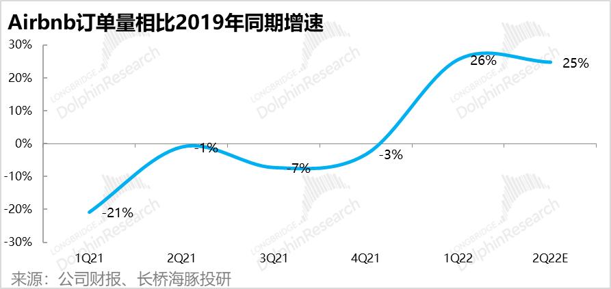 在出游住宿行业整体复苏的背景下,海豚君相信所有文旅相关企业都能在顺风下受益。然而除了行业beta层面的利好,Airbnb凭借独特民宿赛道的Alpha优势也仍在释放。参考Airbnb、Booking和Expedia三大OTA平台对于2Q22业绩的指引和国际大行的预测,Airbnb在2Q订单量会高于19年同期25%以上,相比之下Booking的订单量相较19年同期会增长10%+,而Expedia则仍会低于19年同期水平。