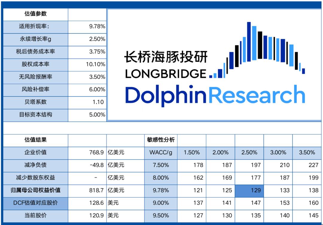 在DCF估值中,考虑到当下10年期国债上升,因此把无风险报酬率从2.5%提升至3.5%。在WACC=9.54%,g=2.5%的假设下,最终估值为103美元/股。也就是说,当前的股价基本反映了中性偏保守预期下的价值。更多的溢价除了靠大盘情绪面的好转,否则就需要靠不断超预期的业绩来打消市场对通胀影响的担忧。