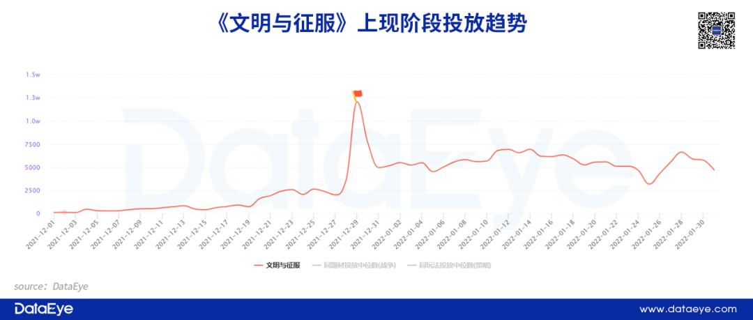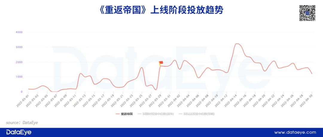 作为对比,《文明与征服》《重返帝国》在投放层面则非常强势,呈现压倒性的势头,抢夺大量的投放用户注意力。