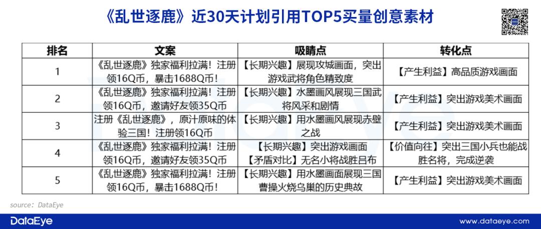 从吸睛点来看: 《乱世逐鹿》计划投放数较多的创意素材重点突出产品美术上的特点,包括采用传统水墨画的形式,展现三国事情的历史典故作为“长期兴趣”吸引对三国历史关注较多的目标用户,同时也尝试通过小将击败吕布的场景设计,形成“矛盾对比”吸睛点,同时也突出游戏核心主张“三国无小将,你我皆英雄”的核心营销主张。