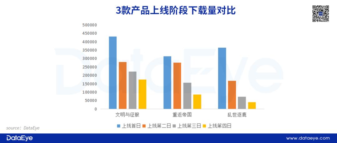 从产品上线初期数据来看:与大厂产品仍有距离。以目前的市场情况,《乱世逐鹿》整体表现出色,但是实际对比今年上线的另外两款新秀阵营SLG,却仍有一段较大的距离。产品前4天下载量显示,《乱世逐鹿》首日下载量预计高达36W次,但后续表现下滑明显,总下载量与《文明与征服》和《重返帝国》都有差距。