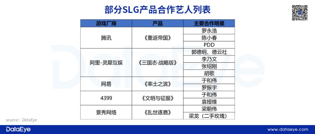 不少SLG都签约过代言人,借助其本身的流量和话题度,给产品带来更多关注度。 根据DataEye研究院不完全统计,整理如下: