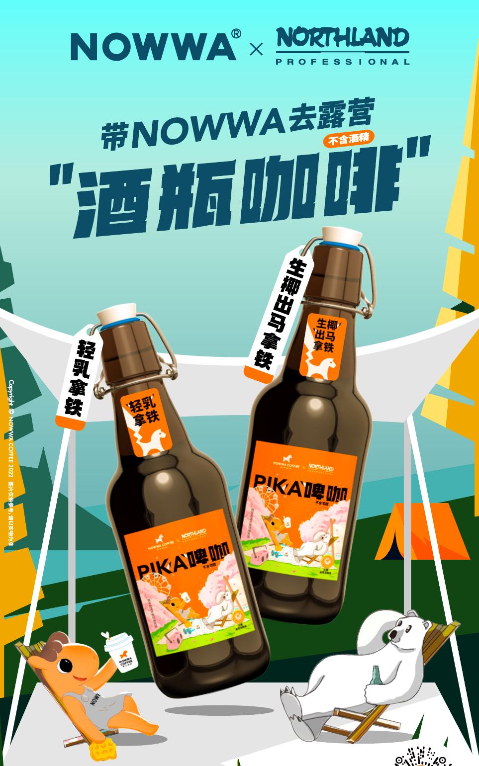 如今年5月「NOWWA 挪瓦咖啡」×「NORTHLAND」联名的新品酒瓶咖啡,就是将现磨咖啡装进啤酒瓶,便携防撒漏的瓶子可以远距离带到露营营地,啤酒瓶的设计既有突破日常画面的惊喜感,也可以和朋友干杯互动,增加了趣味性。