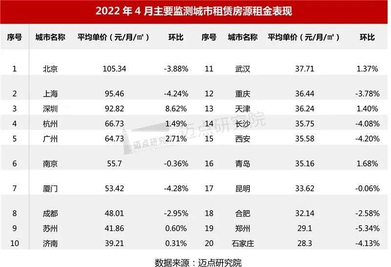 据迈点研究院发布的《2022年4月长租公寓发展报告》显示, 4月份,全国主要监测的20城住房租赁市场整体呈现量价齐跌的态势。其中租金TOP10城市平均租金66.32,环比下降1.91%。受到疫情的影响,北京和上海租金下降明显,分别下跌3.88%和4.24%。