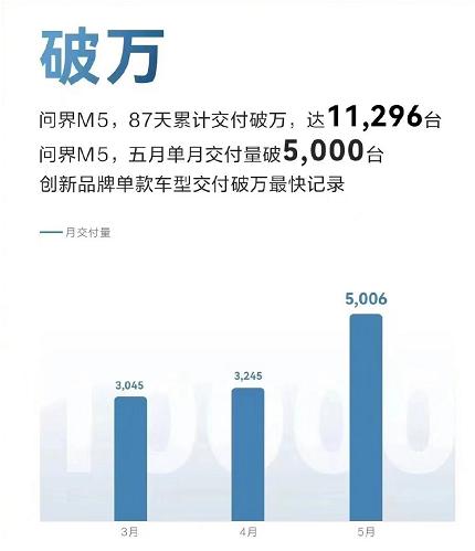 好在最新的交付成绩至少说明这豪赌到目前是成功的。要知道,这次问界M5突破的不是什么预定量数据,而是实打实的新品牌单款车型交付破万的纪录。