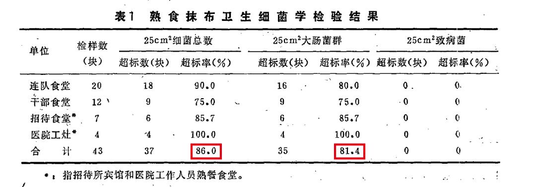 军队食堂,那环境和管理肯定都很严格的,甚至在 90 年代初就做了生、熟区抹布的区分。但在一次熟食区抹布(直接接触容器和食品)的污染统计中,细菌和大肠杆菌的超标率都超过了 80%。