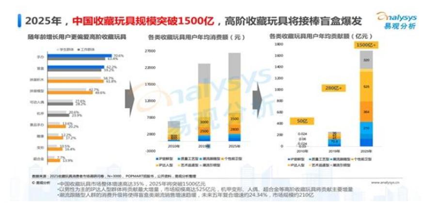 据易观分析3月发布的《中国收藏玩具行业市场洞察报告2021》预计,2025年国内收藏玩具行业市场规模将突破1500亿元,核心消费群体将突破1亿人。
