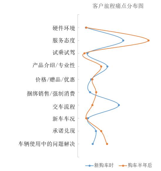 此前,卓思对1,298名购车客户在“新购车时”及“购车半年后”的购车过程体验感受进行了调查,绘制出不同时间下,客户对同样痛点的记忆分布图。对比不同时段的两条曲线会发现: