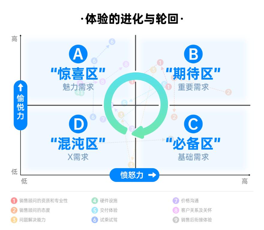 举个例子,十年前当赠送鲜花、拍照留念等交车仪式出现时,它出现在D区“混沌区”——因为只有不到1%的经销商在实施,尚不足以形成影响力;而一年后,当10%的品牌实施时,它进入A区“惊喜区”,成为当红的体验项目;当30%的品牌效仿时,它进入了B区“期待区”,成为客户对交付环节的预期;当70%的品牌实施时,它进入了C区“必备区”,成为客户的标准要求;最后,当所有品牌都在实施时,它又回到了D区,消费者不愿意提起、也不在意,因为它已经毫无刺激。