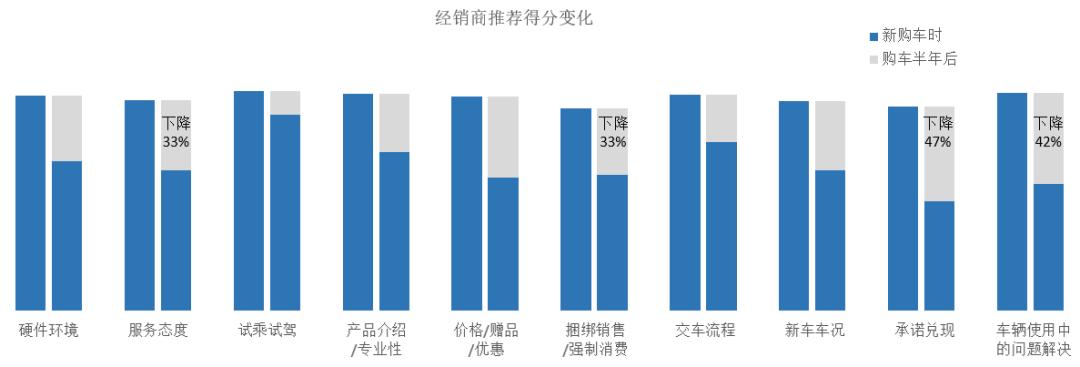 在客户体验痛点外,卓思还探查了客户忠诚度的变化,即客户愿意将购车经销商推荐给亲朋好友的可能性。对比在两个时间点上的结果发现,所有不愉快的体验在经过时间的沉淀后,都会进一步加剧客户对购车经销商的负面情感,从而使其推荐意愿逐步下降。其中,服务态度差、捆绑销售或强制消费、承诺未兑现、车辆使用问题得不到解决等会被客户念念不忘的不良体验,对忠诚度的负面影响更大。