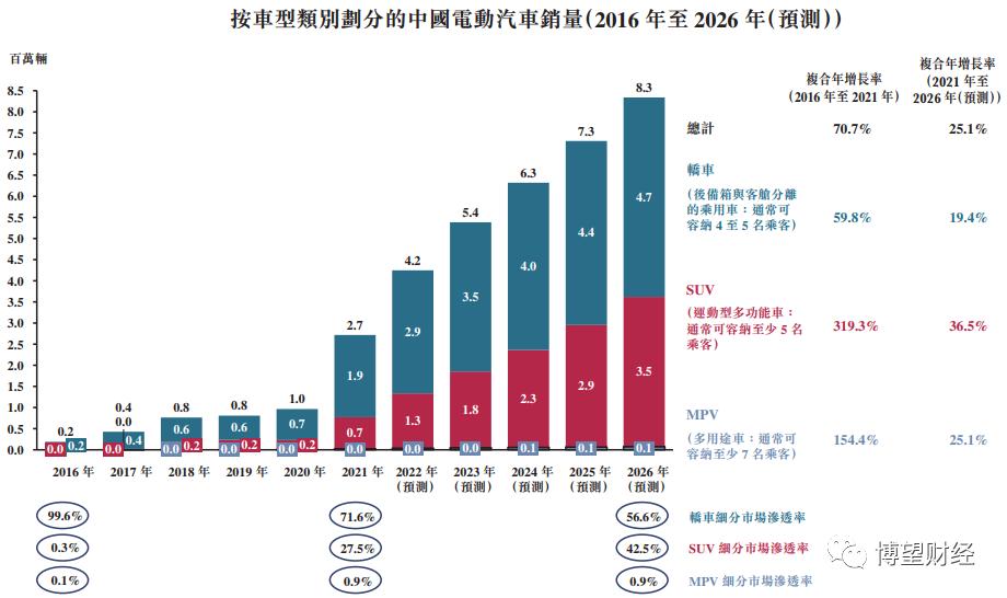 据灼识咨询报告显示,2021年中国电动SUV销量由2016年的576辆增长至2021年的80万辆,复合年增长率为319.3%,并预计2026年销量将达到350万辆,自2021年起复合年增长率为36.5%。此外,2016年电动SUV仅占中国电动汽车总销量的0.3%,2021年占比提升至27.5%,并预计2026年进一步提升至42.5%。