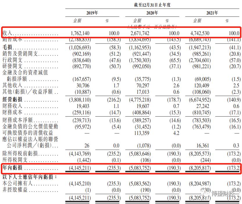 据招股说明书显示,2019年至2021年威马汽车实现营收分别为17.62亿元、26.72亿元和47.43亿元;净亏损分别为41.45亿元、50.84亿元和82.06亿元,三年累计亏损近175亿元;经调整亏损分别为40.4亿元、42.25亿元和53.63亿元。