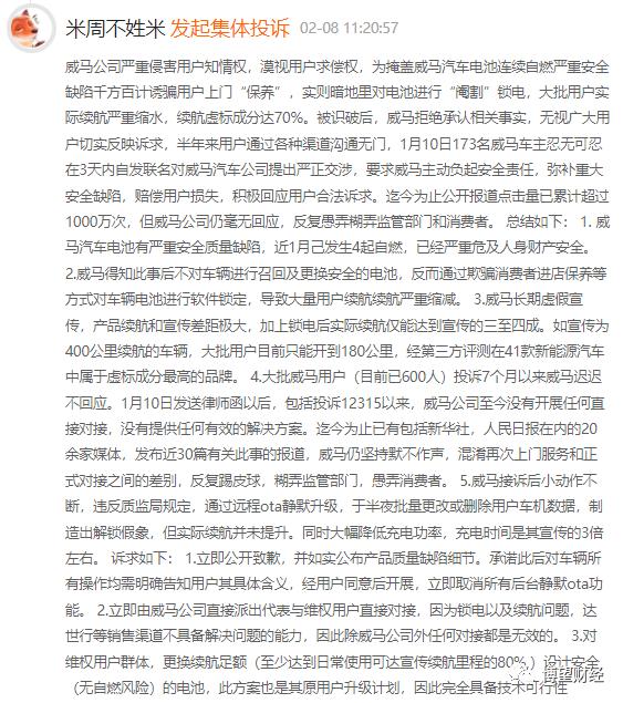 据一位名为“米周不姓米”的消费者投诉中显示,“为掩盖威马汽车电池连续自燃严重安全缺陷千方百计诱骗用户上门‘保养’,实则暗地里对电池进行‘阉割’锁电,大批用户实际续航严重缩水,续航虚标成分达70%。被识破后,威马拒绝承认相关事实,无视广大用户切实反映诉求,半年来用户通过各种渠道沟通无门,1月10日173名威马车主忍无可忍在3天内自发联名对威马汽车公司提出严正交涉,要求威马主动负起安全责任,弥补重大安全缺陷,赔偿用户损失,积极回应用户合法诉求。迄今为止公开报道点击量已累计超过1000万次,但威马公司仍毫无回应,反复愚弄糊弄监管部门和消费者。”
