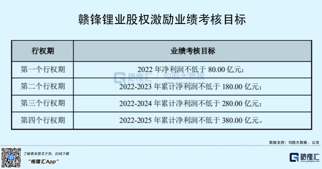以赣锋为例,从已公布的业绩情况,以及最近的股权激励来看,公司对未来3年的盈利情况,增长预期并不高,算下来,2022-2025年的业绩考核目标分别为80亿、100亿、100亿、100亿,除了23年有增长外,24、25年基本处于持平状态。