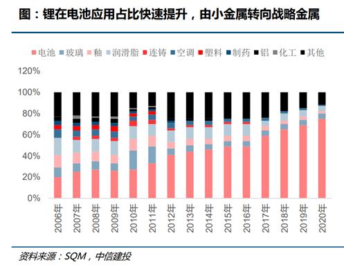 2013年以前,电池在锂的下游应用占比不到30%,之后迅速涨至60%以上,电池行业成为锂最大的消费领域,并迅速将锂矿资源推往战略资源的重要地位。全球的锂资源也随着下游需求的不断强化出现供应短缺,供不应求的结果就是价格上涨,锂资源的价格不断创出新高。