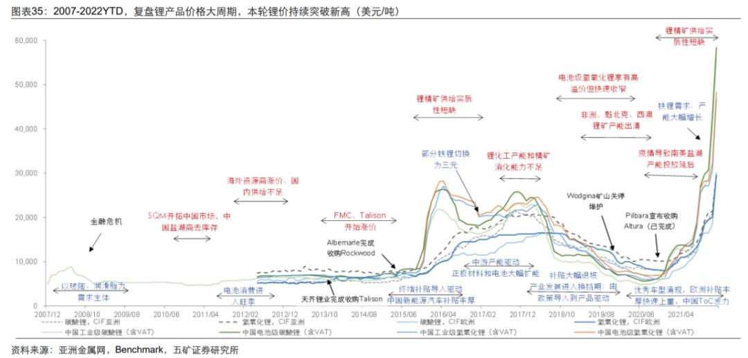 回顾锂资源的价格变动周期,2015年以前,锂的需求相对稳定,锂矿也没有出现大规模的开采,因此价格维持相对平稳的水平。在2015-2016年,以中国为主的国家出台多项产业政策补贴支持新能源汽车产业的发展,锂产品的价格迎来第一轮涨价潮,其间碳酸锂价格从底部4万元/吨最高上涨至约18万元/吨。