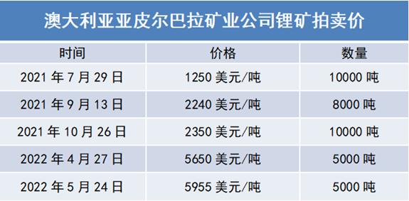 市场究竟有多疯狂,无独有偶,5月24日,澳大利锂矿商亚皮尔巴拉(Pilbara)年内第二次锂精矿拍卖也落幕,成交价达到了5955美元/吨。较4月27日拍卖的成交价5650美元/吨上涨了5%;较2021年10月26拍卖的成交价2350美元/吨上涨了153%。