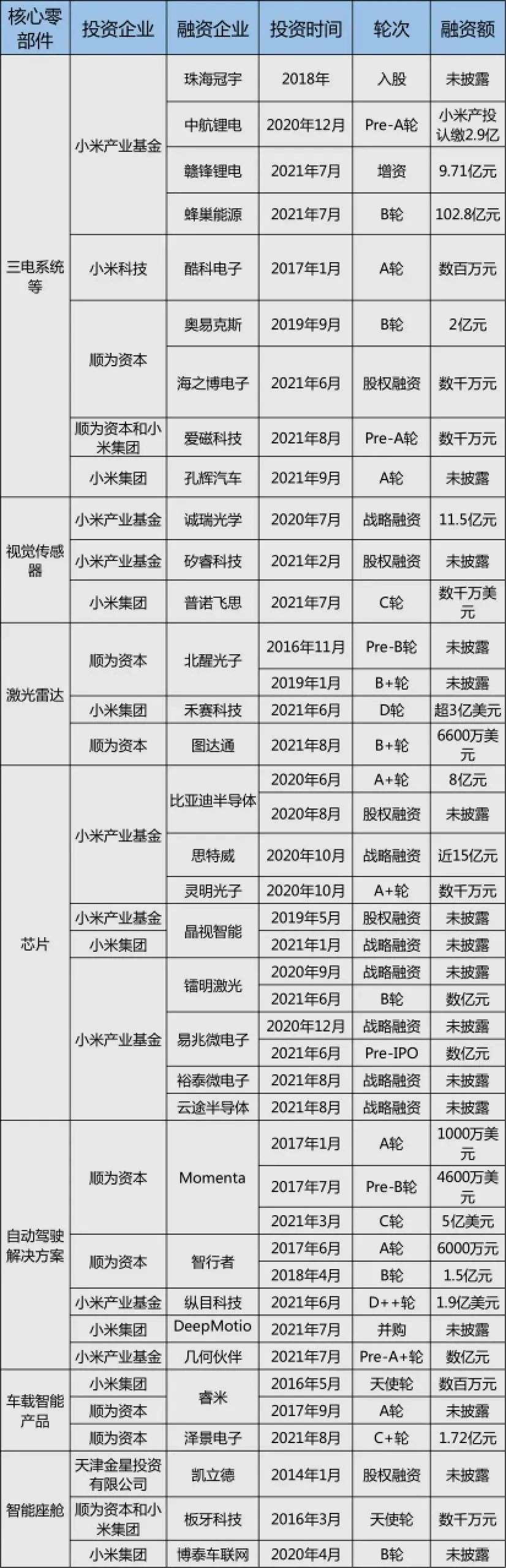 截至目前,包括雷军个人的天使投资机构顺为创业、小米集团、小米产投、顺为资本这几家投资机构,已先后投资了近40家汽车产业链企业,涵盖智能驾驶、车载芯片、动力电池等众多产业链核心技术领域。