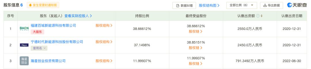 最新股权信息显示,百城新能源系上海快卜第一大股东,持股比例约为38.67%,略高于宁德时代。宁德时代为第二大股东,持股比例约为37.15%。最新入股的瀚星投资持股比例约为12.00%,位列第三大股东。