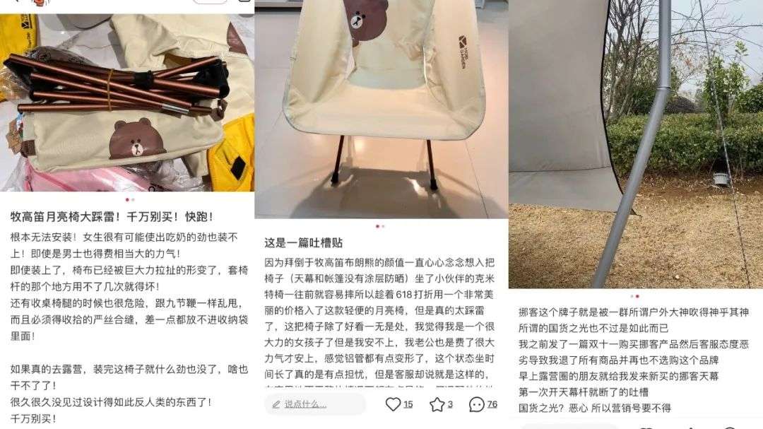 除却质检不合格,消费者的反馈也开始出现一些“踩雷”的声音。锌刻度注意到,在小红书、微博等社交平台上,也有相关的“踩雷帖”,其中包括牧高笛和LINE FRIENDS联名推出的一款月亮椅,不少网友表示不易安装、容易摔跤等。