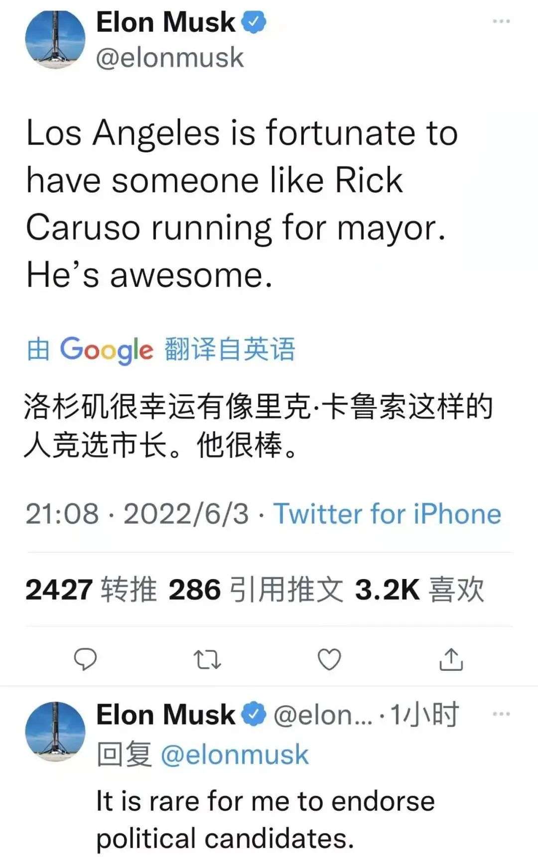 就在裁员消息曝出当晚,马斯克在推特上公开为洛杉矶市长候选人,由共和党转投民主党的亿万富豪卡鲁索站台。“有里克·卡鲁索这样的人竞选市长是洛杉矶市民的幸运,他太棒了。”马斯克写道,应该指出的是,卡鲁索虽然加入了民主党,但其曾公开表示“我不会是一个典型的民主党人”,倒是和马斯克政治倾向的变化颇为相似,而两人对加密货币的态度也相当一致。