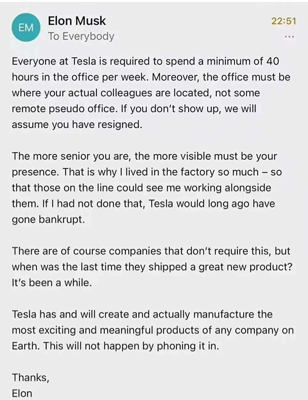 美东时间5月31日晚,马斯克给员工发送了一封主题为“不再接受远程工作”的电子邮件,要求特斯拉员工每周必须在办公室工作至少40个小时,并放出狠话:“如果你不出现,我们将默认你已经辞职。”