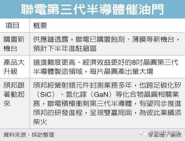 2021年为了冲刺氮化镓领域,联电与封测厂颀邦宣布双方将透过换股,换股合作后,联电将成为颀邦最大单一股东,也将透过与颀邦的上下游整合,扩大在第三代半导体领域的布局。据悉,颀邦在电源功率组件及射频组件封测市场经营多年,封测技术已量产于砷化钾、碳化硅、氮化镓等化合物晶圆。联电在2021年财报中也指出,将积极投入开发化合物半导体氮化镓功率组件与射频组件制程开发,拟结合颀邦在电源功率组件及射频组件封测市场之领先地位与先进封装技术,加速开发高效能电源功率组件及5G射频组件之市场商机。