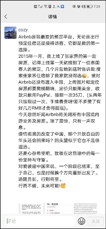 爱彼迎宣布告别的当天,一位房东发了一条长长的朋友圈。