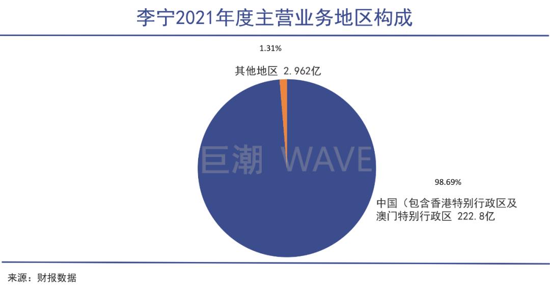 李宁面临的是同样的尴尬。在2009年,李宁曾经提出,十年后实现20%收入来自海外。如今十年已过,根据2021年年报显示,海外业务占比也仅有1.3%左右,还不如361度。