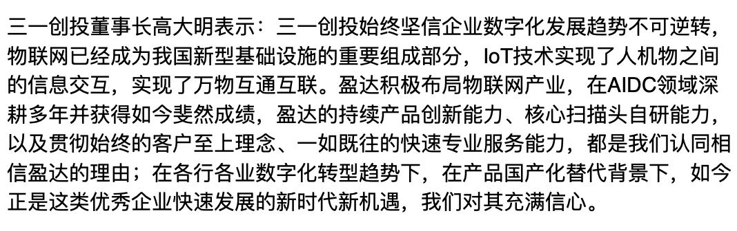 目前,盈达聚焦新零售、物流、智能制造三大行业,服务客户已覆盖盒马鲜生、美团优选、菜鸟驿站、中国邮政、美的、比亚迪等知名企业。