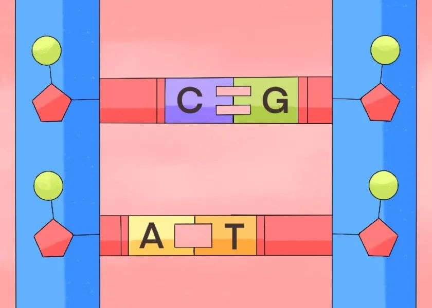DNA 链由碱基对构成,腺嘌呤脱氧核糖核苷酸(A)与胸腺嘧啶脱氧核糖核苷酸(T),鸟嘌呤脱氧核糖核苷酸(G)与胞嘧啶脱氧核糖核苷酸(C)两两组和。