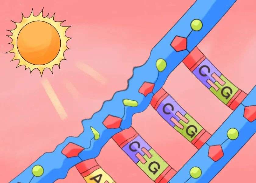 当人类过度暴露于紫外线照射下时,两个相邻的碱基对的核苷酸可能会因为被「晒化了」而粘连在一起。