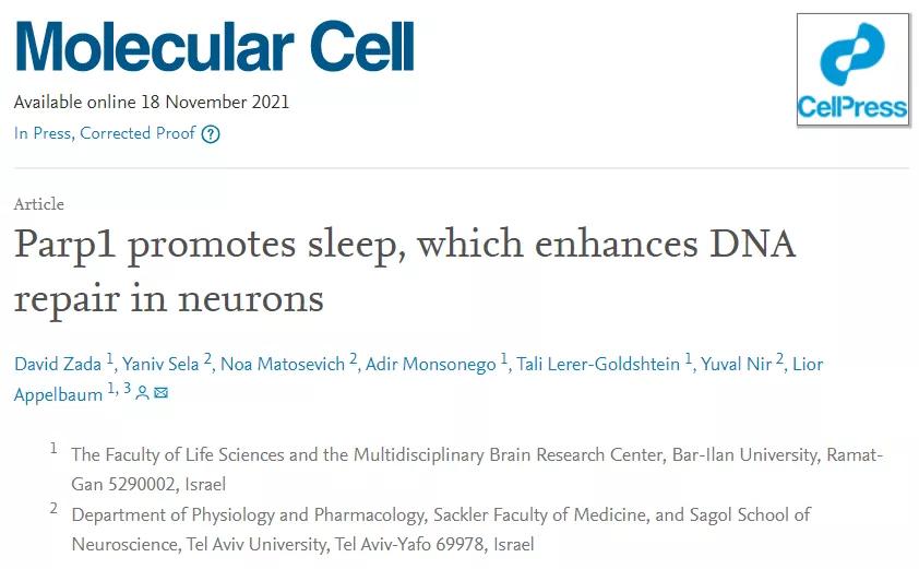 [12] Zada D, Sela Y, Matosevich N, Monsonego A, Lerer-Goldshtein T, Nir Y, Appelbaum L. Parp1 promotes sleep, which enhances DNA repair in neurons[J]. Mol Cell. 2021 Nov 12:S1097-2765(21)00933-3. https://pubmed.ncbi.nlm.nih.gov/34798058/