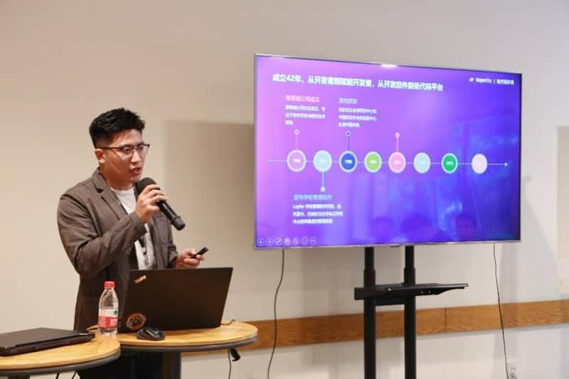 接下来,葡萄城低代码生态总监宁伟为大家带来了“低代码五问”的分享。宁伟通过结合实际案例与自身的开发体验,声情并茂地向大家展示了低代码与传统开发技术的不同,依次回答了“低代码是什么”、“低代码能用来做什么”、“如何组建低代码开发团队”、“低代码如何与编码开发相结合”、“如何学习低代码”等技术决策者关注的核心问题。