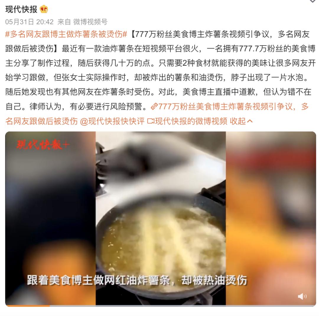 前不久,社交网络上爆出一条热搜:网友跟美食博主炸薯条被烫伤。说的是,有位粉丝数百万的美食博主在视频里教人炸薯条,很多人照着做,结果被“爆炸”的薯条和热油烫伤。网友晒出了不同的受伤照片,十分值得同情。