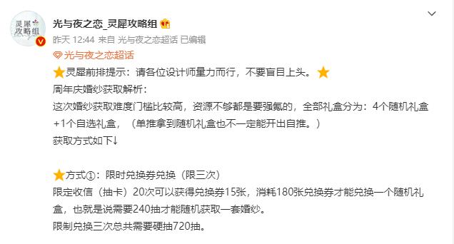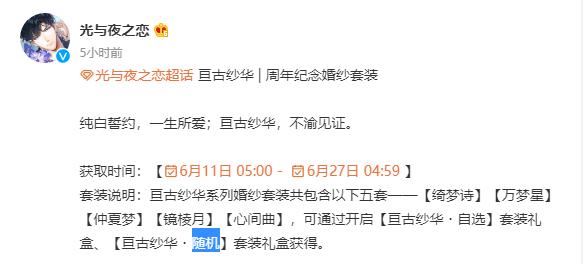 但到了6月5号,随着活动内容的公开,口碑舆论瞬间反转,玩家的期待也转为差评。起因是官方将周年女主婚纱外观的获得方式设定为“随机”,这两个字成功点燃了玩家的怒火。