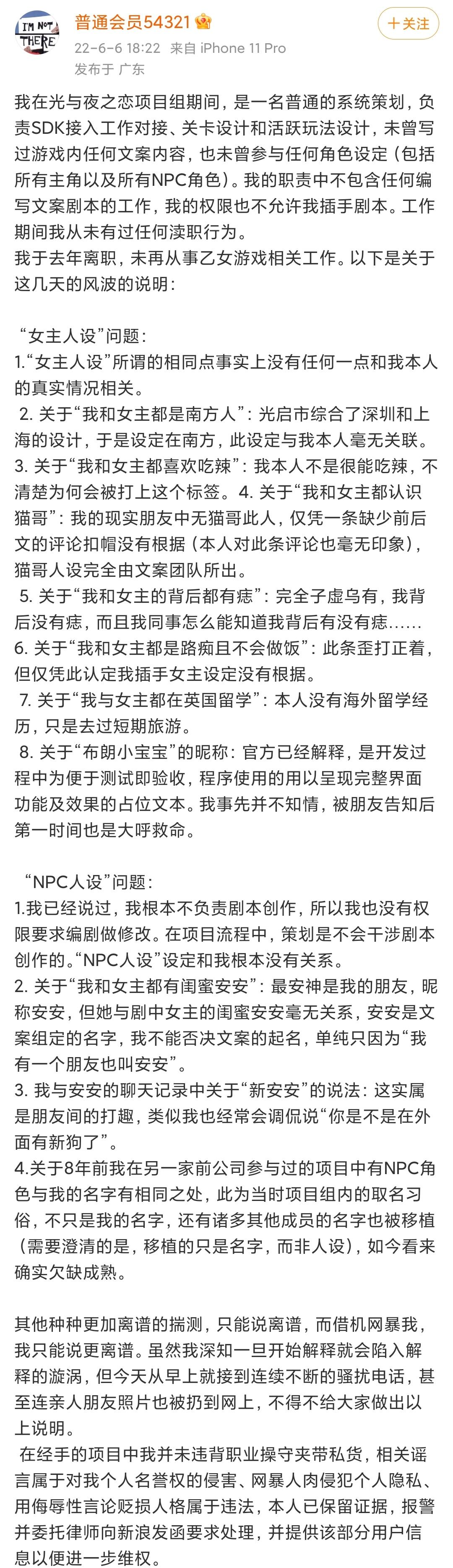 如果只是一次内部人员的隐私探寻,那么本该到此结束。但玩家很快发现这名策划的不少生活日常都与《光夜》女主的设定相似。在性格特征以外,游戏内女主的闺蜜与同事甚至与该策划的闺蜜和同事同名。