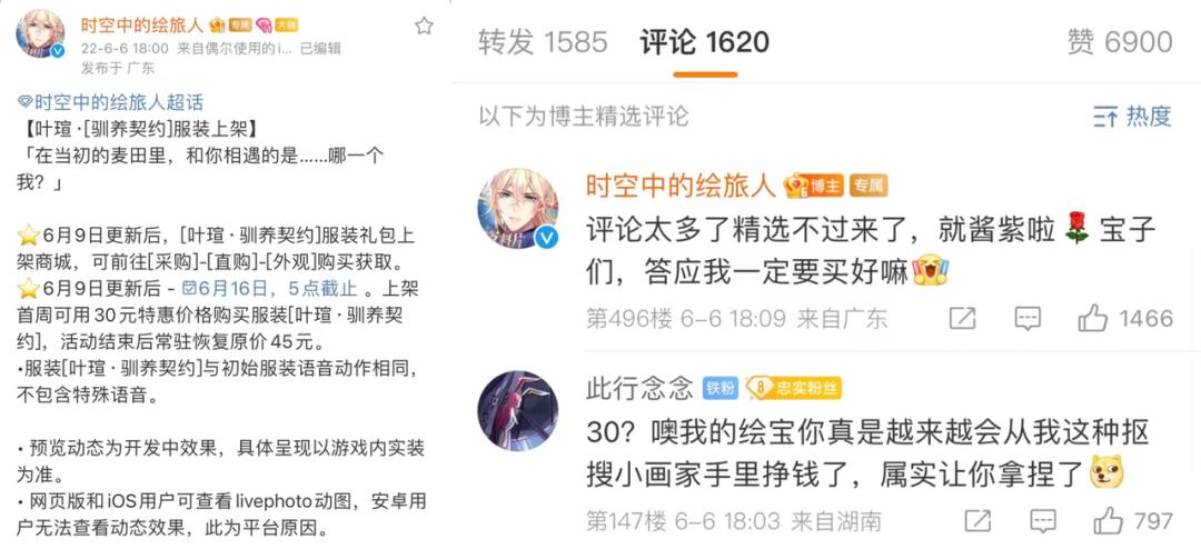 而网易旗下的《时空中的绘旅人》更是在今天下午六点推出男主外观的限时折扣,原价45折后仅需30元,并耐人寻味地开启了微博“评论精选”。