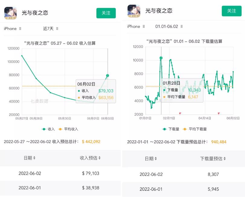 百度指数显示,PV公开后《光夜》搜索指数从四千不到翻倍至近万,七麦数据统计的单日预估下载量及收入也都实现了翻倍增长,可见玩家认可度之高。